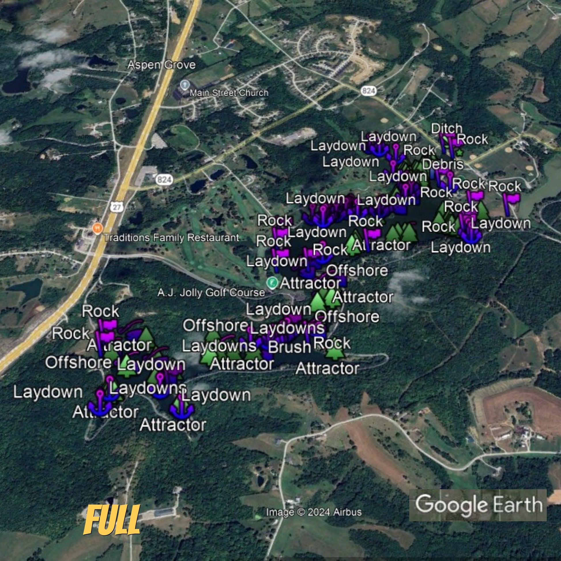 Discover the ultimate bass fishing secrets at A.J. Jolly Lake, KY with our meticulously crafted fishing waypoints. Leveraging the power of Google Earth®, Navionics® as well as other tools, we've pinpointed the most productive hot spots where bass thrive. Delve into the intricacies of the lake breakdown, as our waypoints lead you to strategic locations like brush piles, ledges, rocks, and timber, ensuring you're at the heart of the action.
