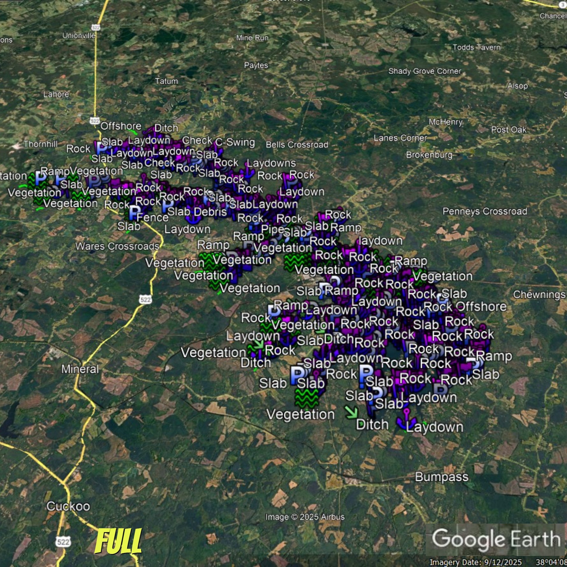 Discover the ultimate bass fishing secrets at Lake Anna, VA with our meticulously crafted fishing waypoints. Leveraging the power of Google Earth®, Navionics® as well as other tools, we've pinpointed the most productive hot spots where bass thrive. Delve into the intricacies of the lake breakdown, as our waypoints lead you to strategic locations like brush piles, ledges, rocks, and timber, ensuring you're at the heart of the action.