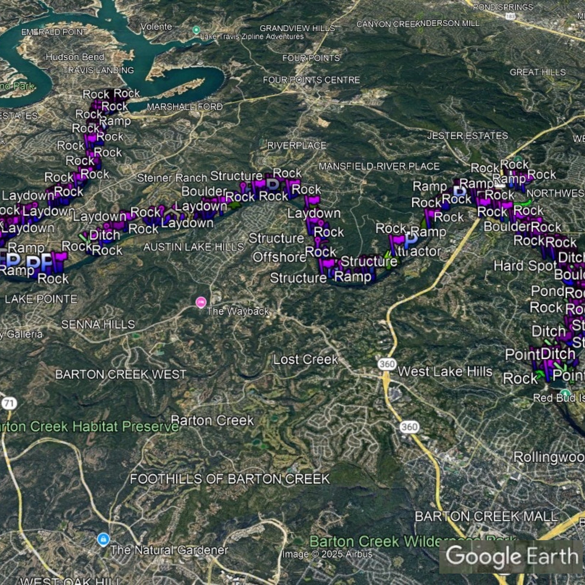 Discover the ultimate bass fishing secrets at Lake Austin with our meticulously crafted fishing waypoints. Leveraging the power of Google Earth®, Navionics® as well as other tools, we've pinpointed the most productive hot spots where bass thrive. Delve into the intricacies of the lake breakdown, as our waypoints lead you to strategic locations like brush piles, ledges, rocks, and timber, ensuring you're at the heart of the action.