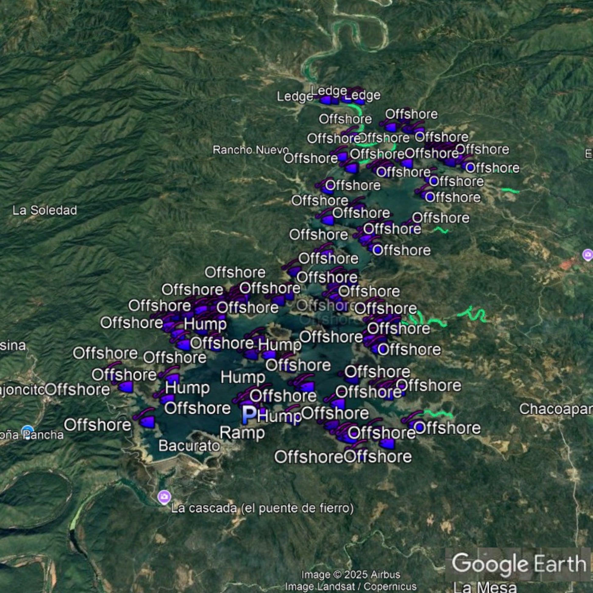 Discover the ultimate bass fishing secrets at Lake Baccarat, Mexico with our meticulously crafted fishing waypoints. Leveraging the power of Google Earth®, Navionics® as well as other tools, we've pinpointed the most productive hot spots where bass thrive. Delve into the intricacies of the lake breakdown, as our waypoints lead you to strategic locations like brush piles, ledges, rocks, and timber, ensuring you're at the heart of the action.