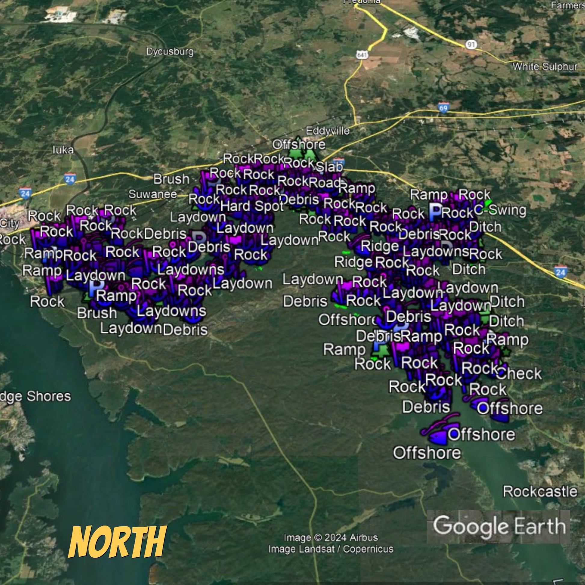 Discover the ultimate bass fishing secrets at Lake Barkley with our meticulously crafted fishing waypoints. Leveraging the power of Google Earth®, Navionics® as well as other tools, we've pinpointed the most productive hot spots where bass thrive. Delve into the intricacies of the lake breakdown, as our waypoints lead you to strategic locations like brush piles, ledges, rocks, and timber, ensuring you're at the heart of the action.