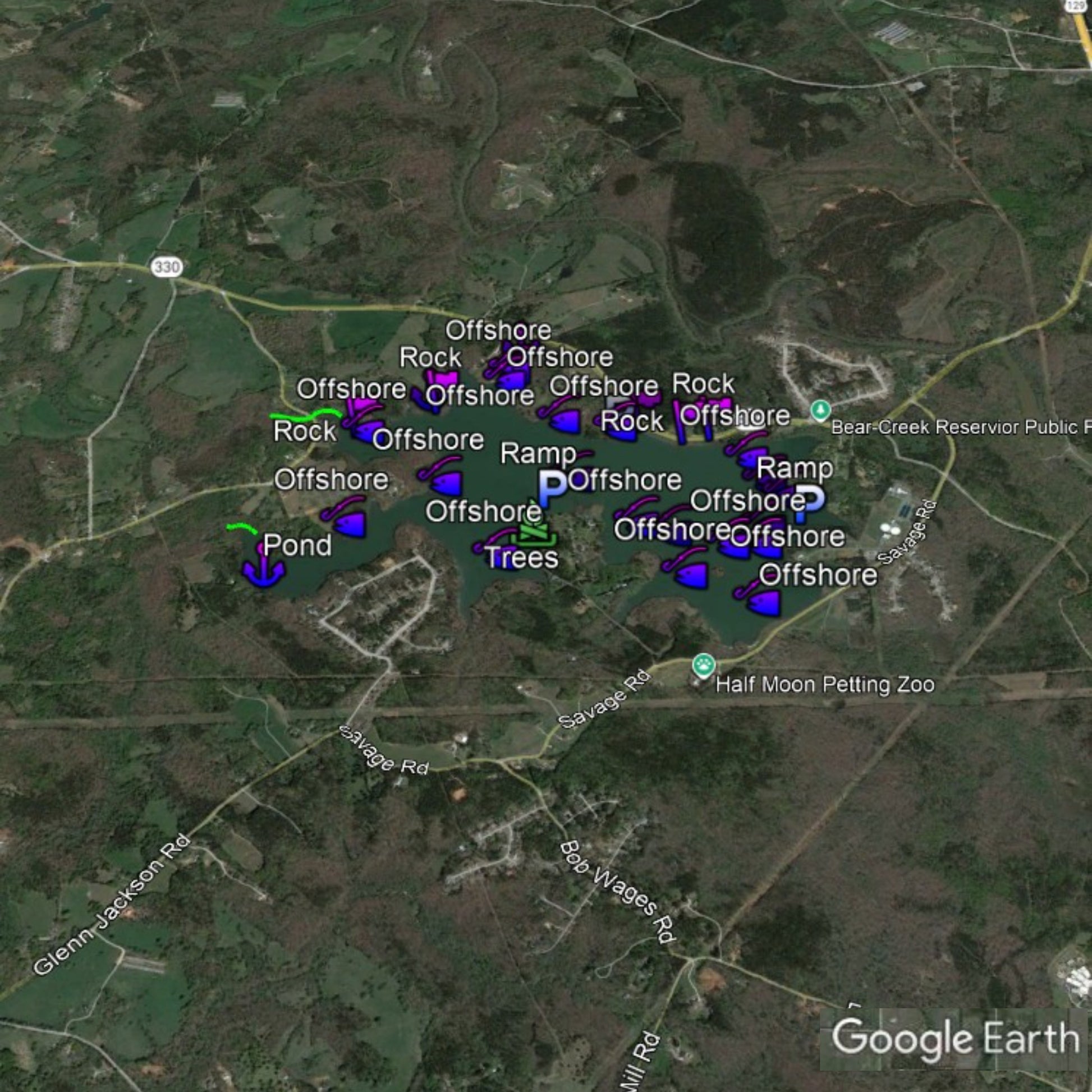 Discover the ultimate bass fishing secrets at Bear Creek Reservoir, GA with our meticulously crafted fishing waypoints. Leveraging the power of Google Earth®, Navionics® as well as other tools, we've pinpointed the most productive hot spots where bass thrive. Delve into the intricacies of the lake breakdown, as our waypoints lead you to strategic locations like brush piles, ledges, rocks, and timber, ensuring you're at the heart of the action.