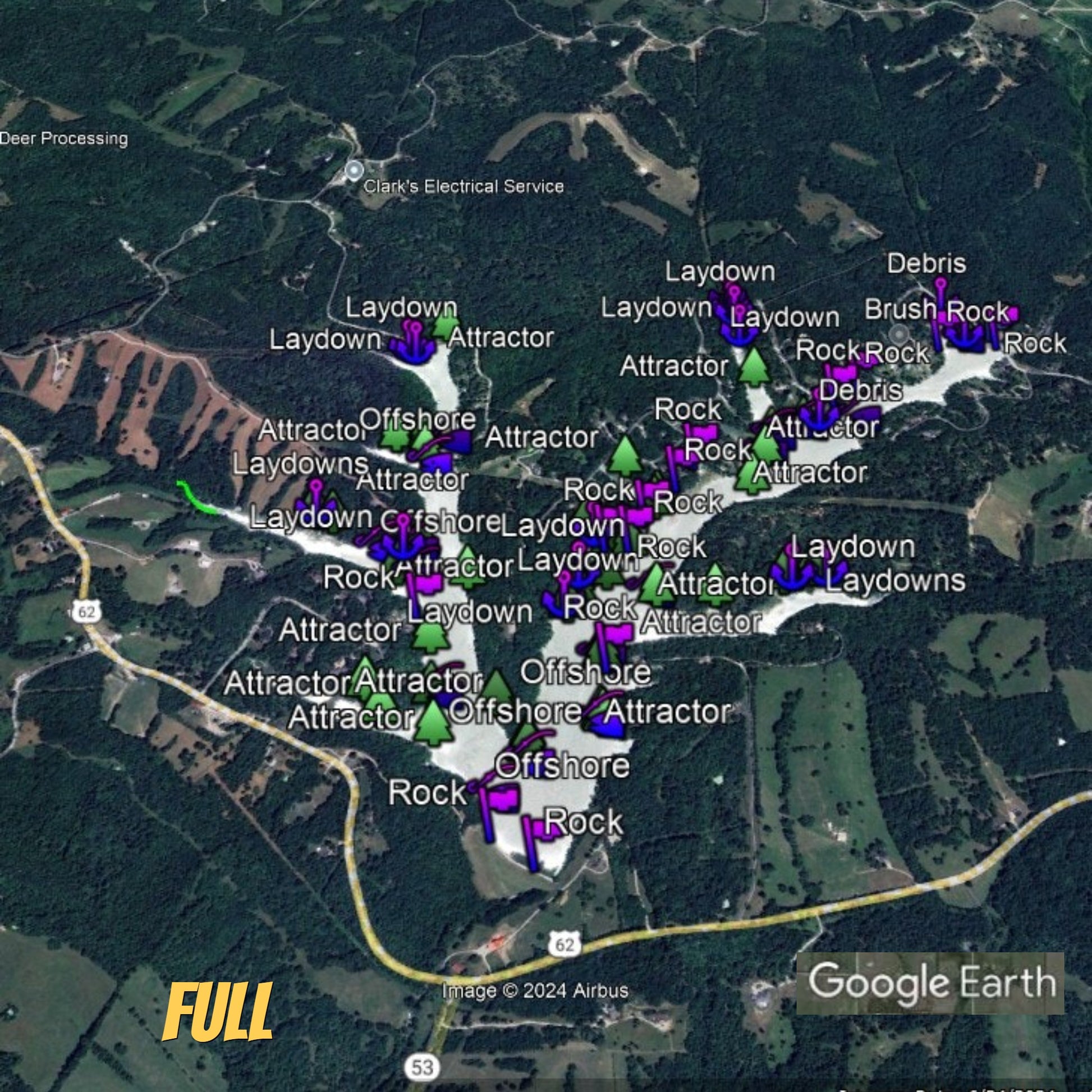 Discover the ultimate bass fishing secrets at Beaver Lake, KY with our meticulously crafted fishing waypoints. Leveraging the power of Google Earth®, Navionics® as well as other tools, we've pinpointed the most productive hot spots where bass thrive. Delve into the intricacies of the lake breakdown, as our waypoints lead you to strategic locations like brush piles, ledges, rocks, and timber, ensuring you're at the heart of the action.