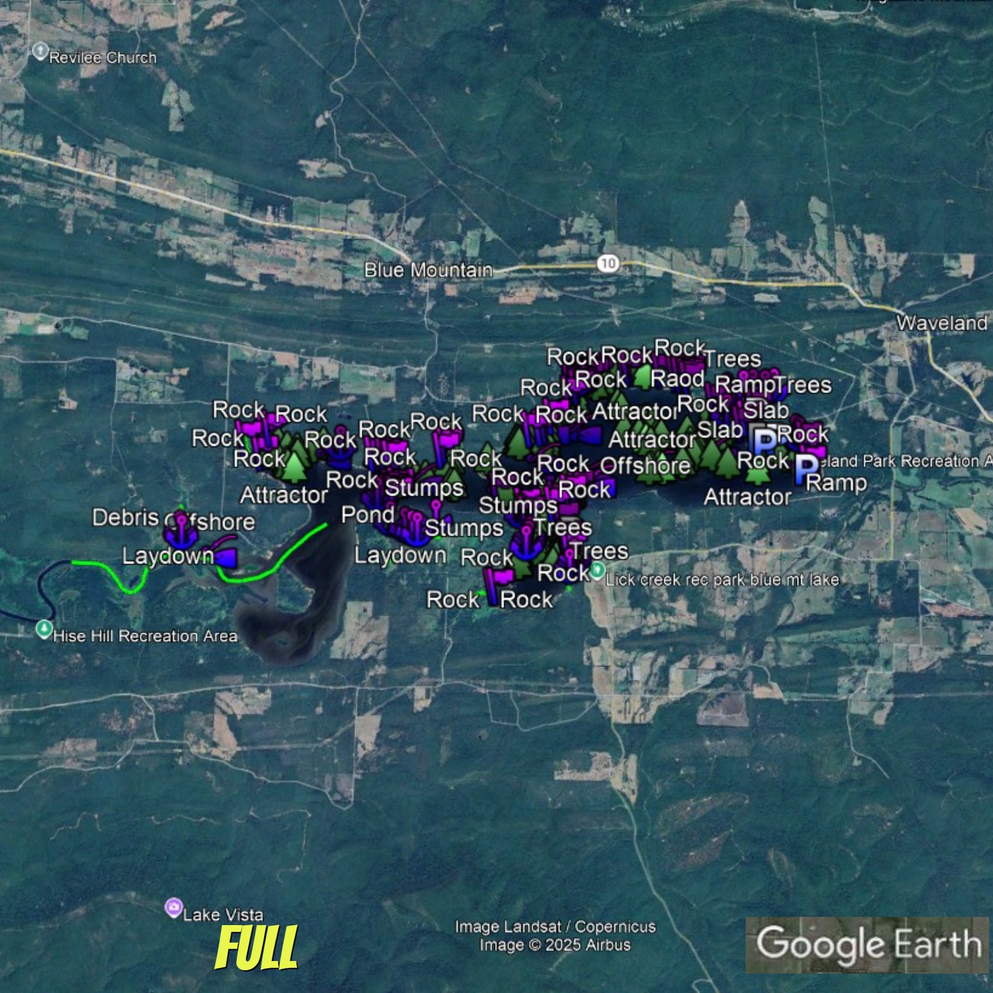 Discover the ultimate bass fishing secrets at Blue Mountain Lake, AR with our meticulously crafted fishing waypoints. Leveraging the power of Google Earth®, Navionics® as well as other tools, we've pinpointed the most productive hot spots where bass thrive. Delve into the intricacies of the lake breakdown, as our waypoints lead you to strategic locations like brush piles, ledges, rocks, and timber, ensuring you're at the heart of the action.