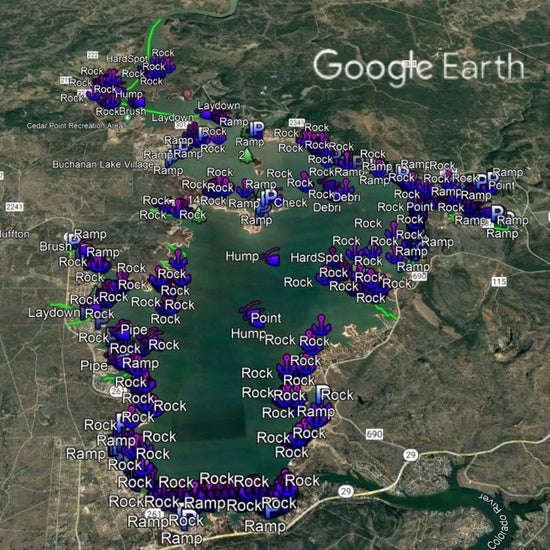 Discover the ultimate bass fishing secrets at Lake Buchanan with our meticulously crafted fishing waypoints. Leveraging the power of Google Earth®, Navionics® as well as other tools, we've pinpointed the most productive hot spots where bass thrive. Delve into the intricacies of the lake breakdown, as our waypoints lead you to strategic locations like brush piles, ledges, rocks, and timber, ensuring you're at the heart of the action.