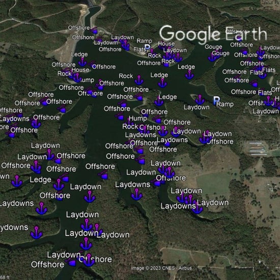 Discover the ultimate bass fishing secrets at Chimney Rock Lake, OK with our meticulously crafted fishing waypoints. Leveraging the power of Google Earth®, Navionics® as well as other tools, we've pinpointed the most productive hot spots where bass thrive. Delve into the intricacies of the lake breakdown, as our waypoints lead you to strategic locations like brush piles, ledges, rocks, and timber, ensuring you're at the heart of the action.