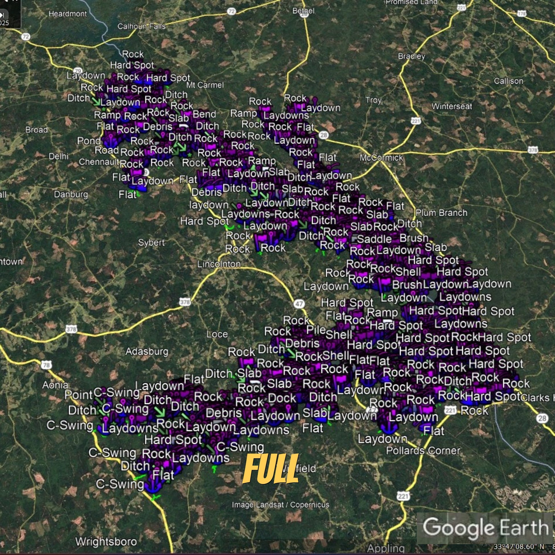 Discover the ultimate bass fishing secrets at Clarks Hill Reservoir with our meticulously crafted fishing waypoints. Leveraging the power of Google Earth®, Navionics® as well as other tools, we've pinpointed the most productive hot spots where bass thrive. Delve into the intricacies of the lake breakdown, as our waypoints lead you to strategic locations like brush piles, ledges, rocks, and timber, ensuring you're at the heart of the action.