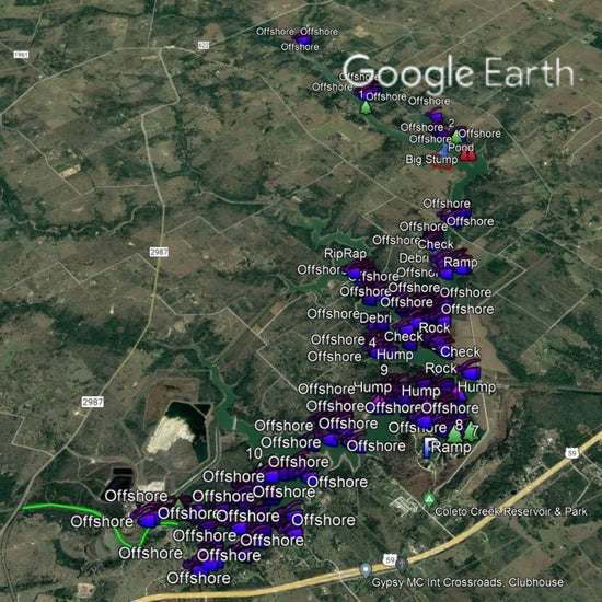 Discover the ultimate bass fishing secrets at Coleto Creek Reservoir with our meticulously crafted fishing waypoints. Leveraging the power of Google Earth®, Navionics® as well as other tools, we've pinpointed the most productive hot spots where bass thrive. Delve into the intricacies of the lake breakdown, as our waypoints lead you to strategic locations like brush piles, ledges, rocks, and timber, ensuring you're at the heart of the action.