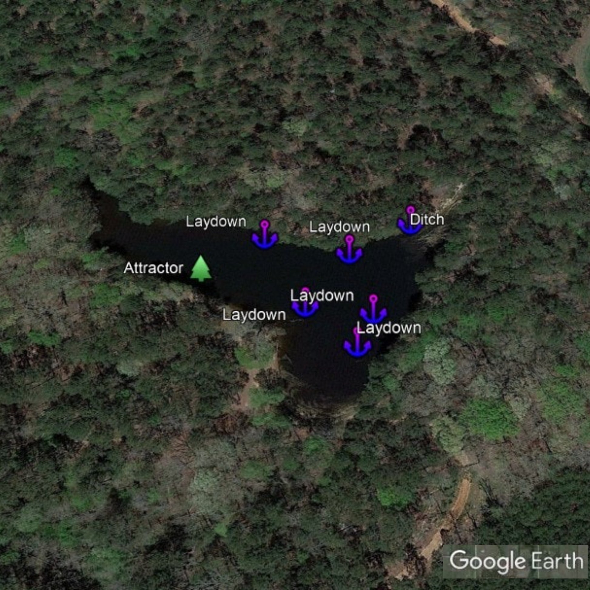 Discover the ultimate bass fishing secrets at Crossroads Lake, GA with our meticulously crafted fishing waypoints. Leveraging the power of Google Earth®, Navionics® as well as other tools, we've pinpointed the most productive hot spots where bass thrive. Delve into the intricacies of the lake breakdown, as our waypoints lead you to strategic locations like brush piles, ledges, rocks, and timber, ensuring you're at the heart of the action.