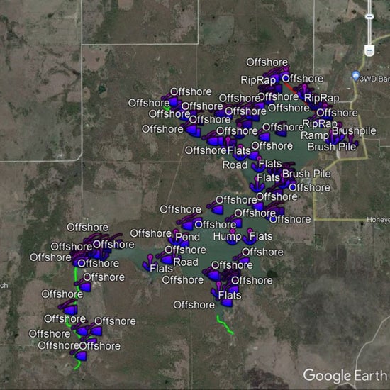 Discover the ultimate bass fishing secrets at Dripping Springs Lake, OK with our meticulously crafted fishing waypoints. Leveraging the power of Google Earth®, Navionics® as well as other tools, we've pinpointed the most productive hot spots where bass thrive. Delve into the intricacies of the lake breakdown, as our waypoints lead you to strategic locations like brush piles, ledges, rocks, and timber, ensuring you're at the heart of the action.