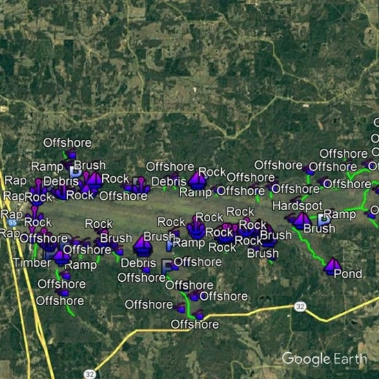 Discover the ultimate bass fishing secrets at Enid Lake, MS with our meticulously crafted fishing waypoints. Leveraging the power of Google Earth®, Navionics® as well as other tools, we've pinpointed the most productive hot spots where bass thrive. Delve into the intricacies of the lake breakdown, as our waypoints lead you to strategic locations like brush piles, ledges, rocks, and timber, ensuring you're at the heart of the action.