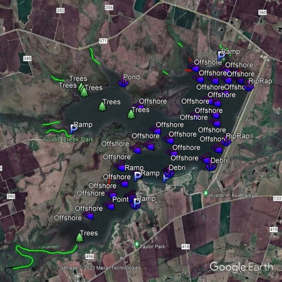 Discover the ultimate bass fishing secrets at Granger Lake with our meticulously crafted fishing waypoints. Leveraging the power of Google Earth®, Navionics® as well as other tools, we've pinpointed the most productive hot spots where bass thrive. Delve into the intricacies of the lake breakdown, as our waypoints lead you to strategic locations like brush piles, ledges, rocks, and timber, ensuring you're at the heart of the action.