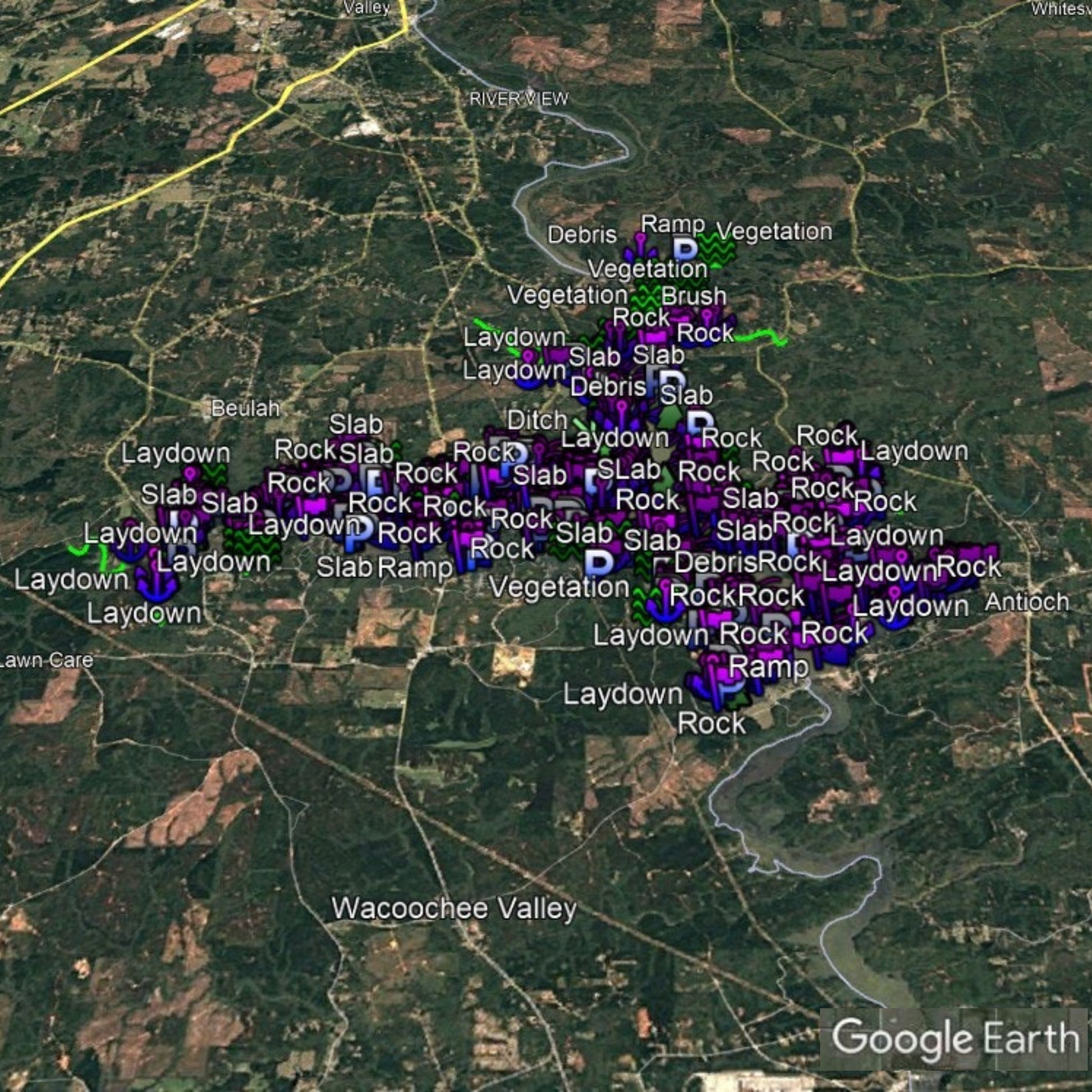 Discover the ultimate bass fishing secrets at Lake Harding, GA/AL with our meticulously crafted fishing waypoints. Leveraging the power of Google Earth®, Navionics® as well as other tools, we've pinpointed the most productive hot spots where bass thrive. Delve into the intricacies of the lake breakdown, as our waypoints lead you to strategic locations like brush piles, ledges, rocks, and timber, ensuring you're at the heart of the action.
