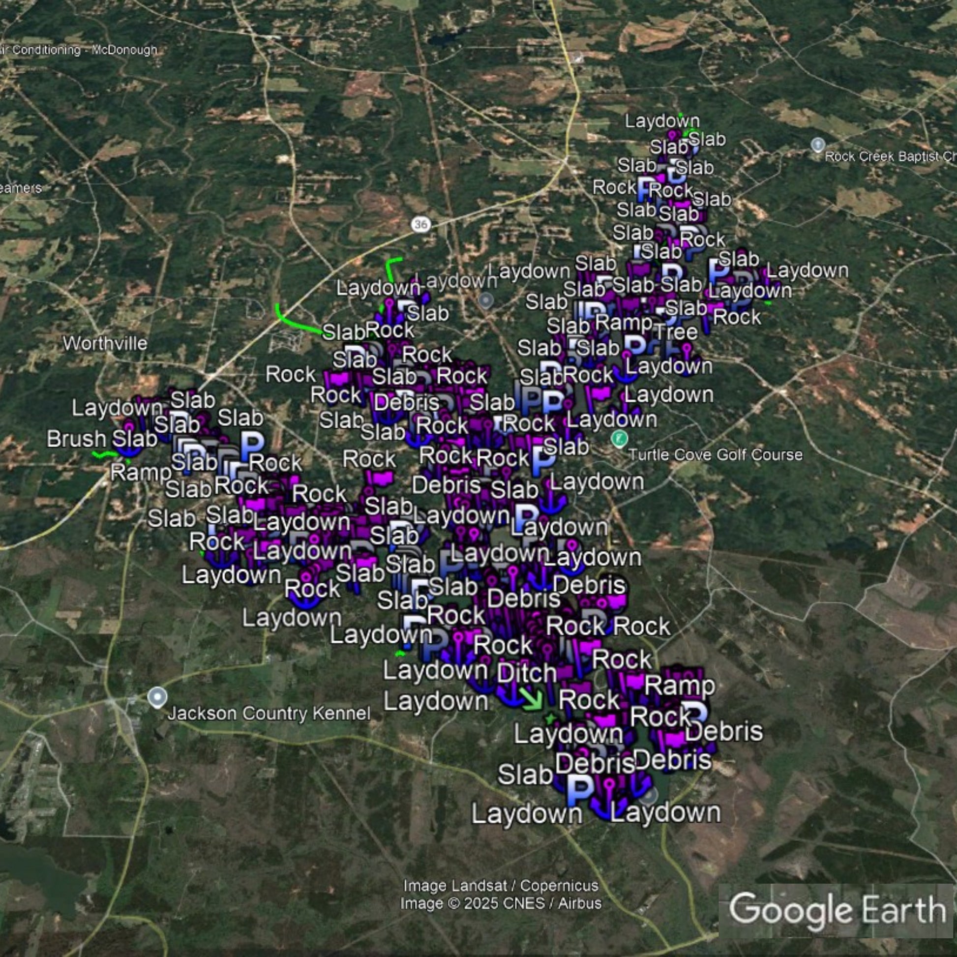 Discover the ultimate bass fishing secrets at Lake Jackson, GA with our meticulously crafted fishing waypoints. Leveraging the power of Google Earth®, Navionics® as well as other tools, we've pinpointed the most productive hot spots where bass thrive. Delve into the intricacies of the lake breakdown, as our waypoints lead you to strategic locations like brush piles, ledges, rocks, and timber, ensuring you're at the heart of the action.
