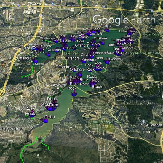 Discover the ultimate bass fishing secrets at Joe Pool Lake with our meticulously crafted fishing waypoints. Leveraging the power of Google Earth®, Navionics® as well as other tools, we've pinpointed the most productive hot spots where bass thrive. Delve into the intricacies of the lake breakdown, as our waypoints lead you to strategic locations like brush piles, ledges, rocks, and timber, ensuring you're at the heart of the action.