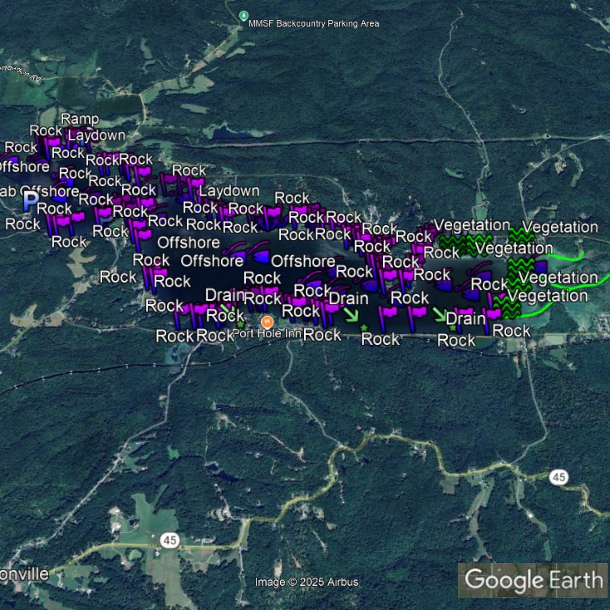 Discover the ultimate bass fishing secrets at Lake Lemon, IN with our meticulously crafted fishing waypoints. Leveraging the power of Google Earth®, Navionics® as well as other tools, we've pinpointed the most productive hot spots where bass thrive. Delve into the intricacies of the lake breakdown, as our waypoints lead you to strategic locations like brush piles, ledges, rocks, and timber, ensuring you're at the heart of the action.