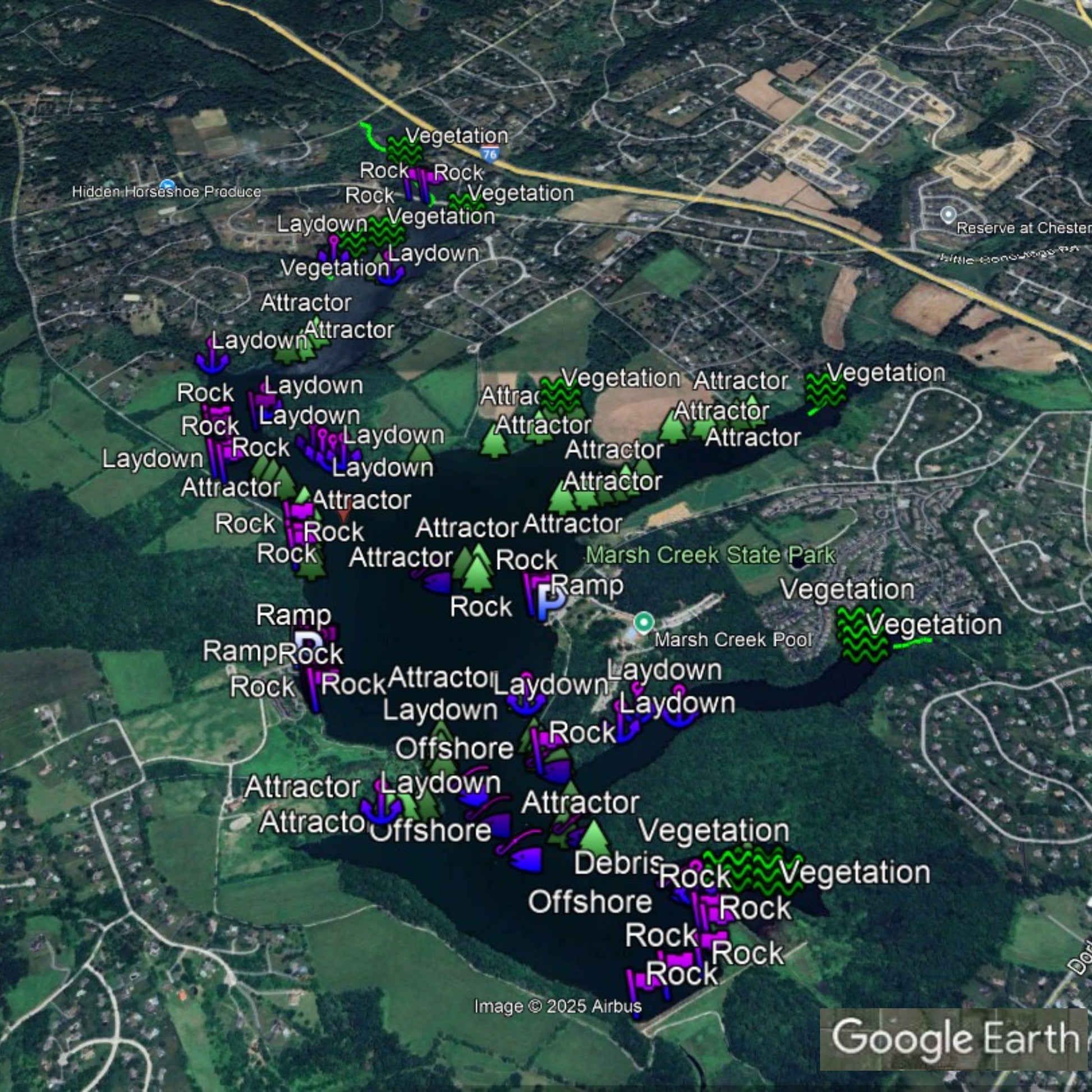 Discover the ultimate bass fishing secrets at Marsh Creek Lake, PA with our meticulously crafted fishing waypoints. Leveraging the power of Google Earth®, Navionics® as well as other tools, we've pinpointed the most productive hot spots where bass thrive. Delve into the intricacies of the lake breakdown, as our waypoints lead you to strategic locations like brush piles, ledges, rocks, and timber, ensuring you're at the heart of the action.