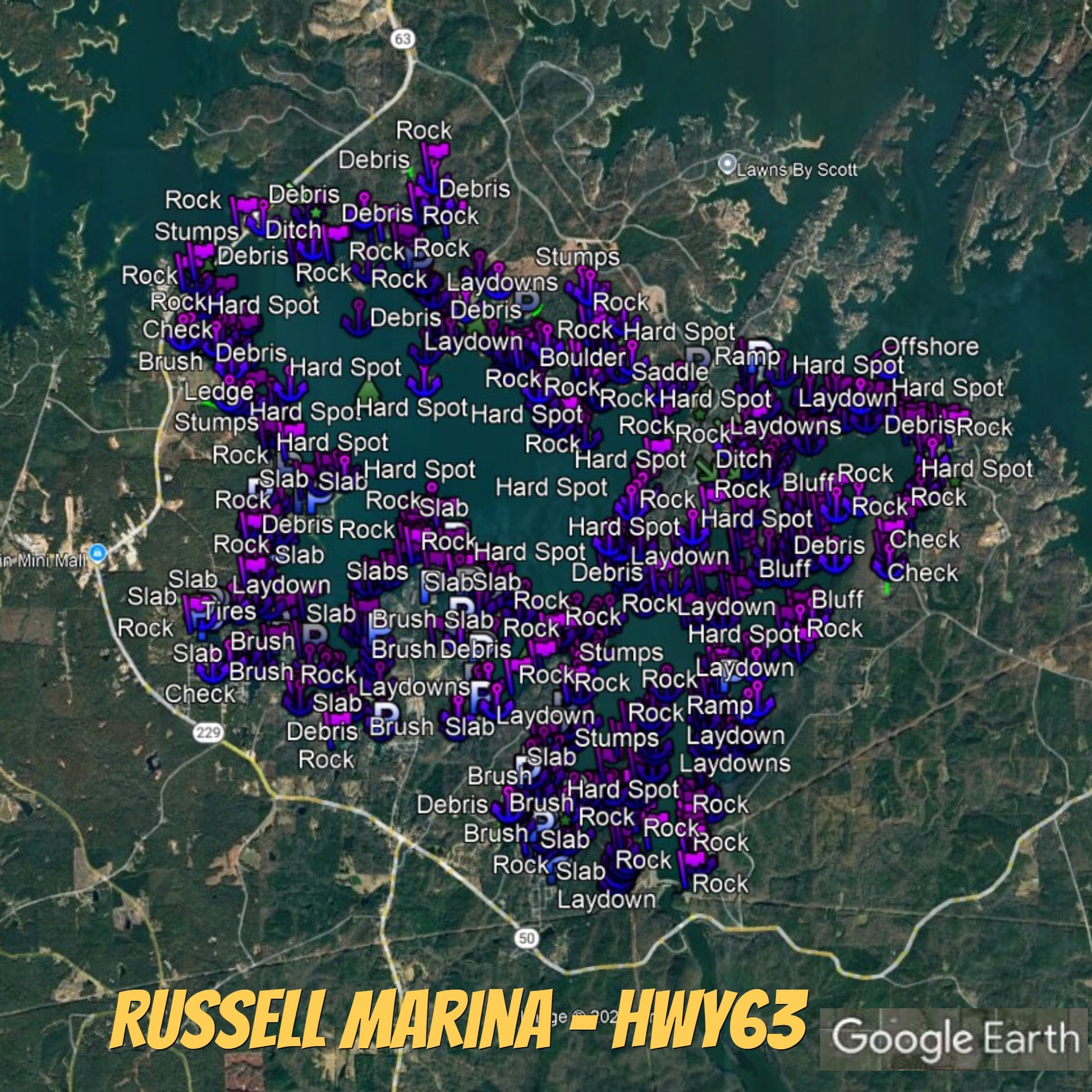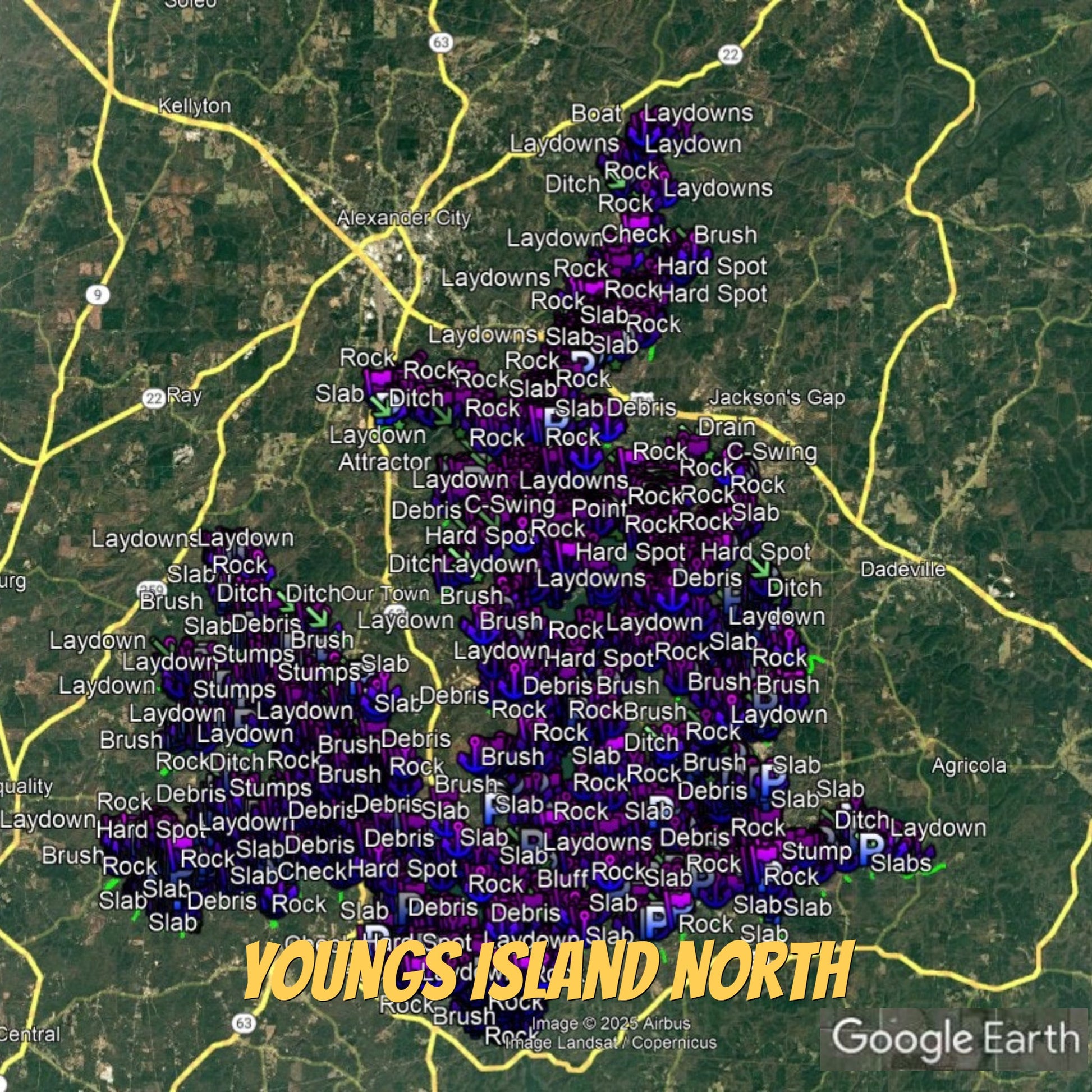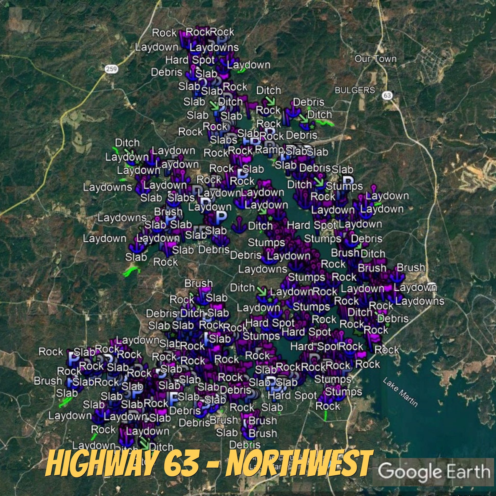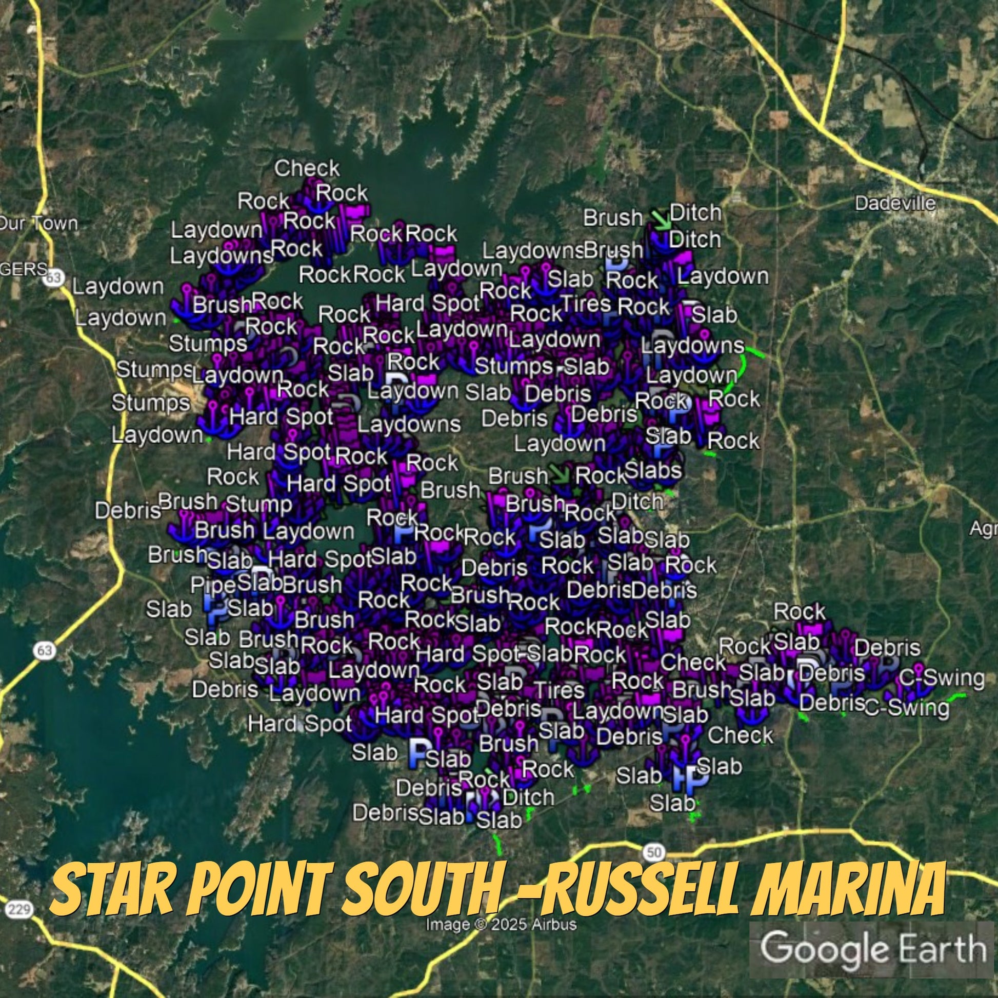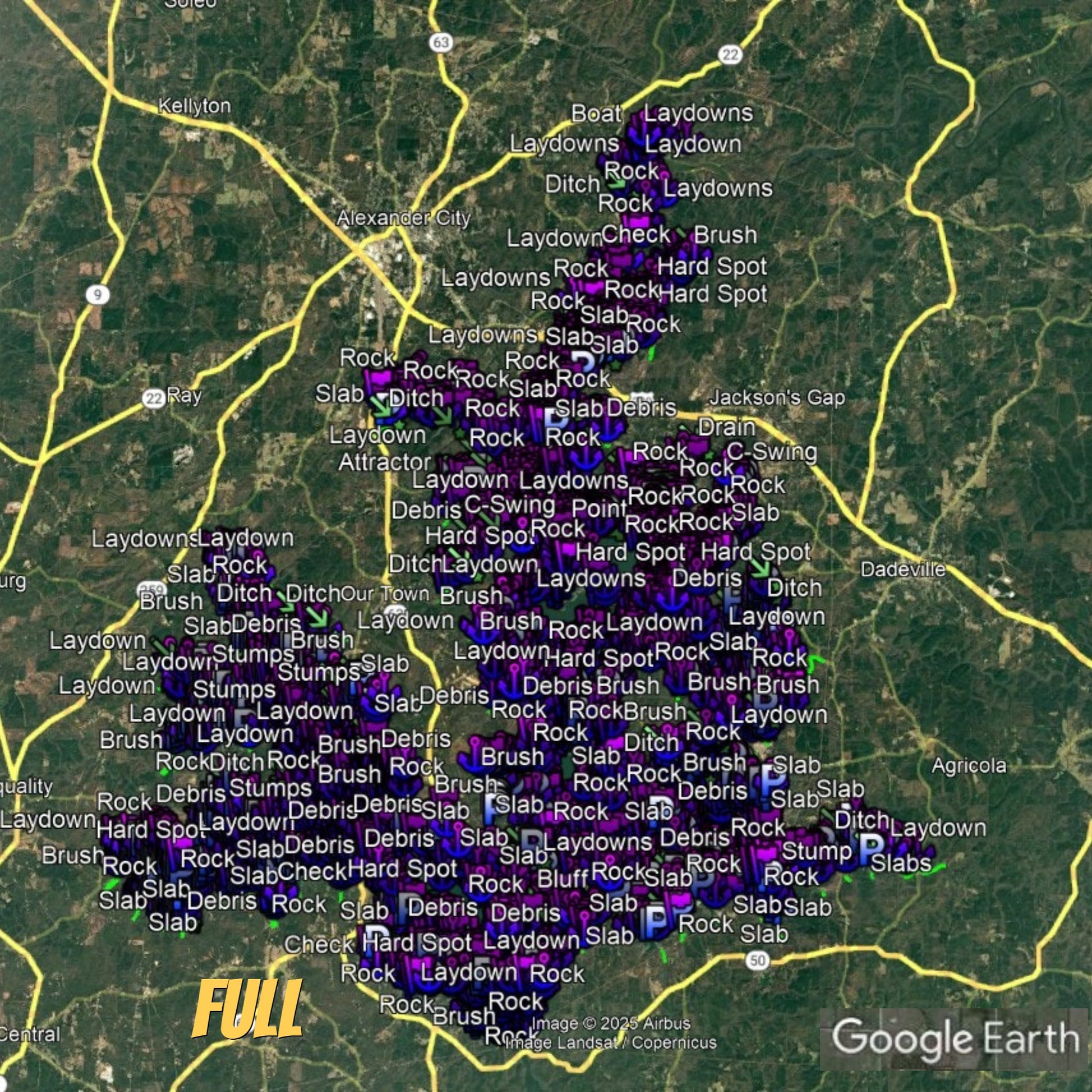 Discover the ultimate bass fishing secrets at Lake Martin, AL with our meticulously crafted fishing waypoints. Leveraging the power of Google Earth®, Navionics® as well as other tools, we've pinpointed the most productive hot spots where bass thrive. Delve into the intricacies of the lake breakdown, as our waypoints lead you to strategic locations like brush piles, ledges, rocks, and timber, ensuring you're at the heart of the action.
