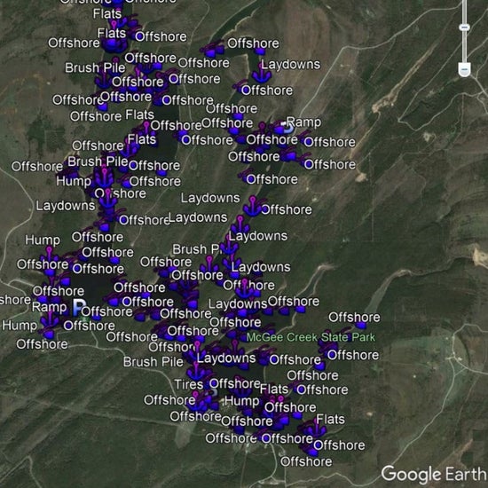 Discover the ultimate bass fishing secrets at McGee Creek Reservoir, OK with our meticulously crafted fishing waypoints. Leveraging the power of Google Earth®, Navionics® as well as other tools, we've pinpointed the most productive hot spots where bass thrive. Delve into the intricacies of the lake breakdown, as our waypoints lead you to strategic locations like brush piles, ledges, rocks, and timber, ensuring you're at the heart of the action.