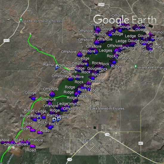 Discover the ultimate bass fishing secrets at Lake Meredith with our meticulously crafted fishing waypoints. Leveraging the power of Google Earth®, Navionics® as well as other tools, we've pinpointed the most productive hot spots where bass thrive. Delve into the intricacies of the lake breakdown, as our waypoints lead you to strategic locations like brush piles, ledges, rocks, and timber, ensuring you're at the heart of the action.