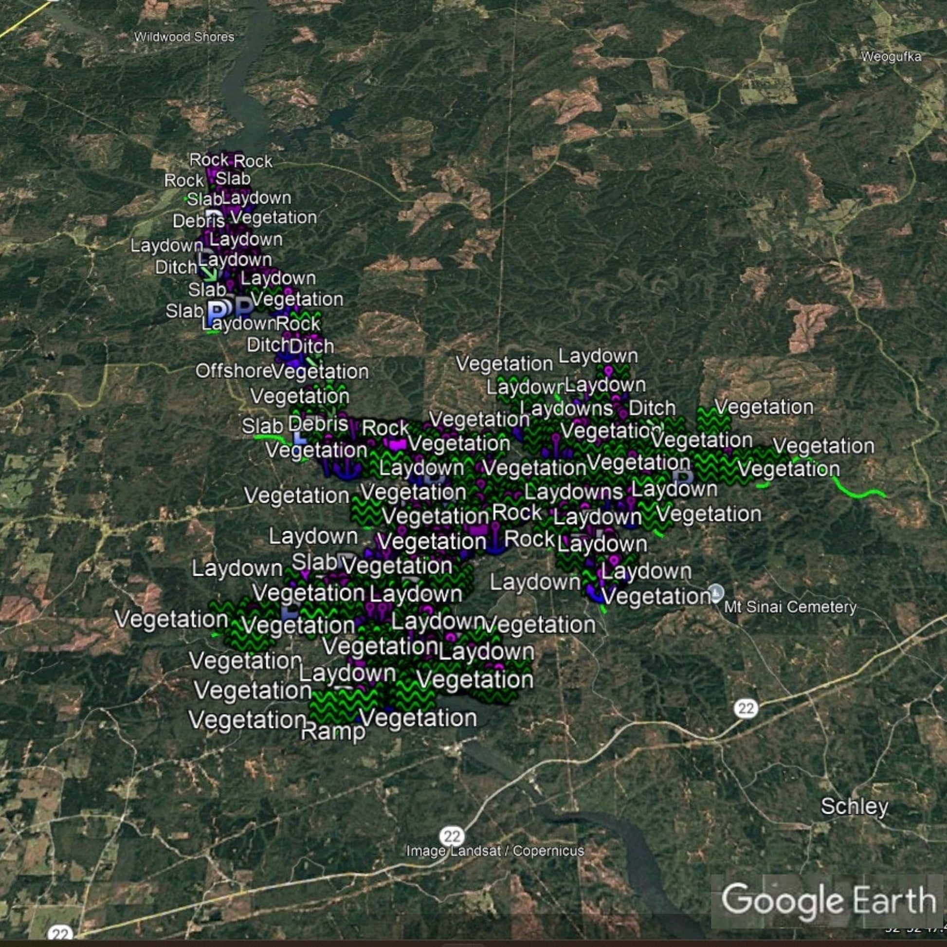 Discover the ultimate bass fishing secrets at Mitchell Lake, AL with our meticulously crafted fishing waypoints. Leveraging the power of Google Earth®, Navionics® as well as other tools, we've pinpointed the most productive hot spots where bass thrive. Delve into the intricacies of the lake breakdown, as our waypoints lead you to strategic locations like brush piles, ledges, rocks, and timber, ensuring you're at the heart of the action.