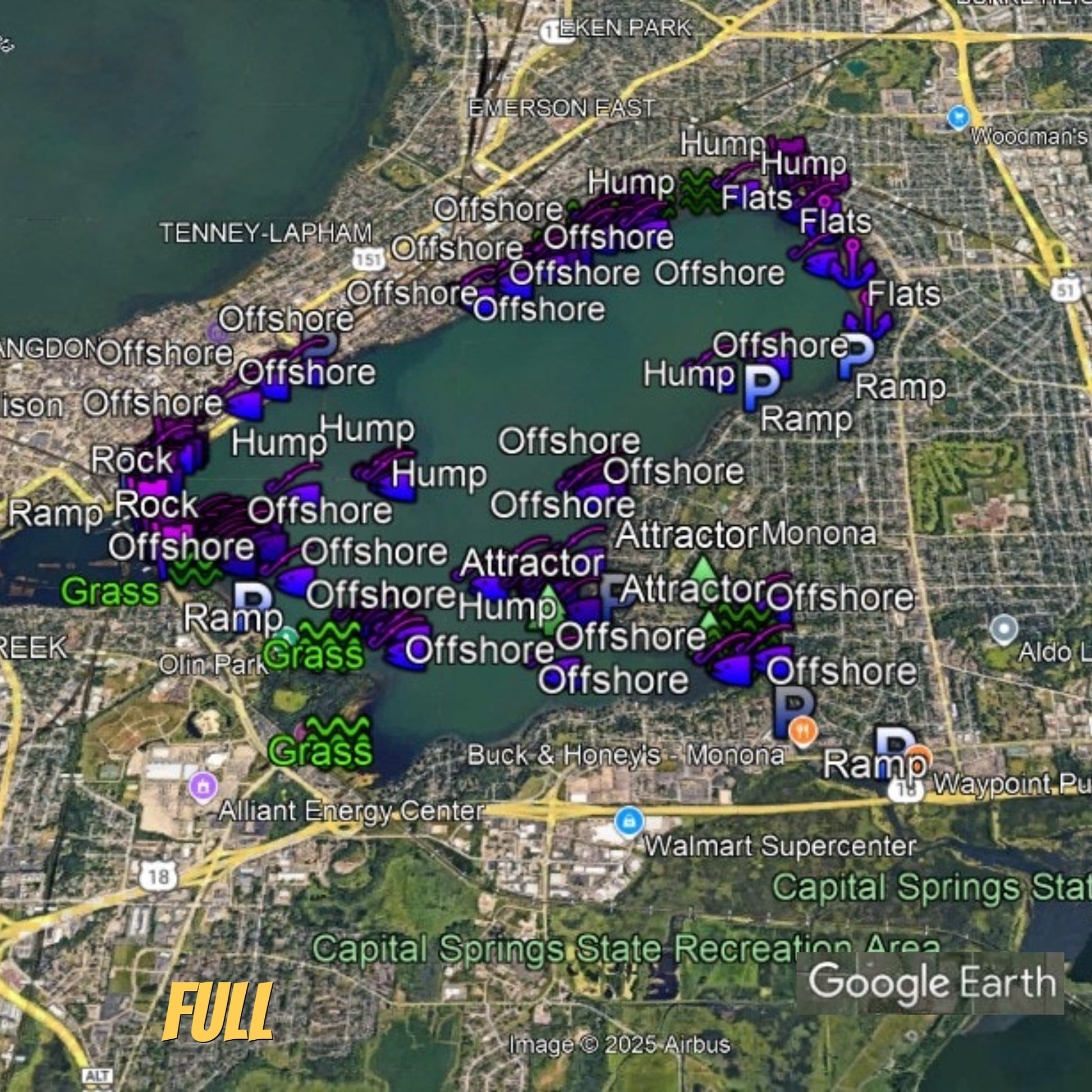 Discover the ultimate bass fishing secrets at Lake Monona with our meticulously crafted fishing waypoints. Leveraging the power of Google Earth®, Navionics® as well as other tools, we've pinpointed the most productive hot spots where bass thrive. Delve into the intricacies of the lake breakdown, as our waypoints lead you to strategic locations like brush piles, ledges, rocks, and timber, ensuring you're at the heart of the action.