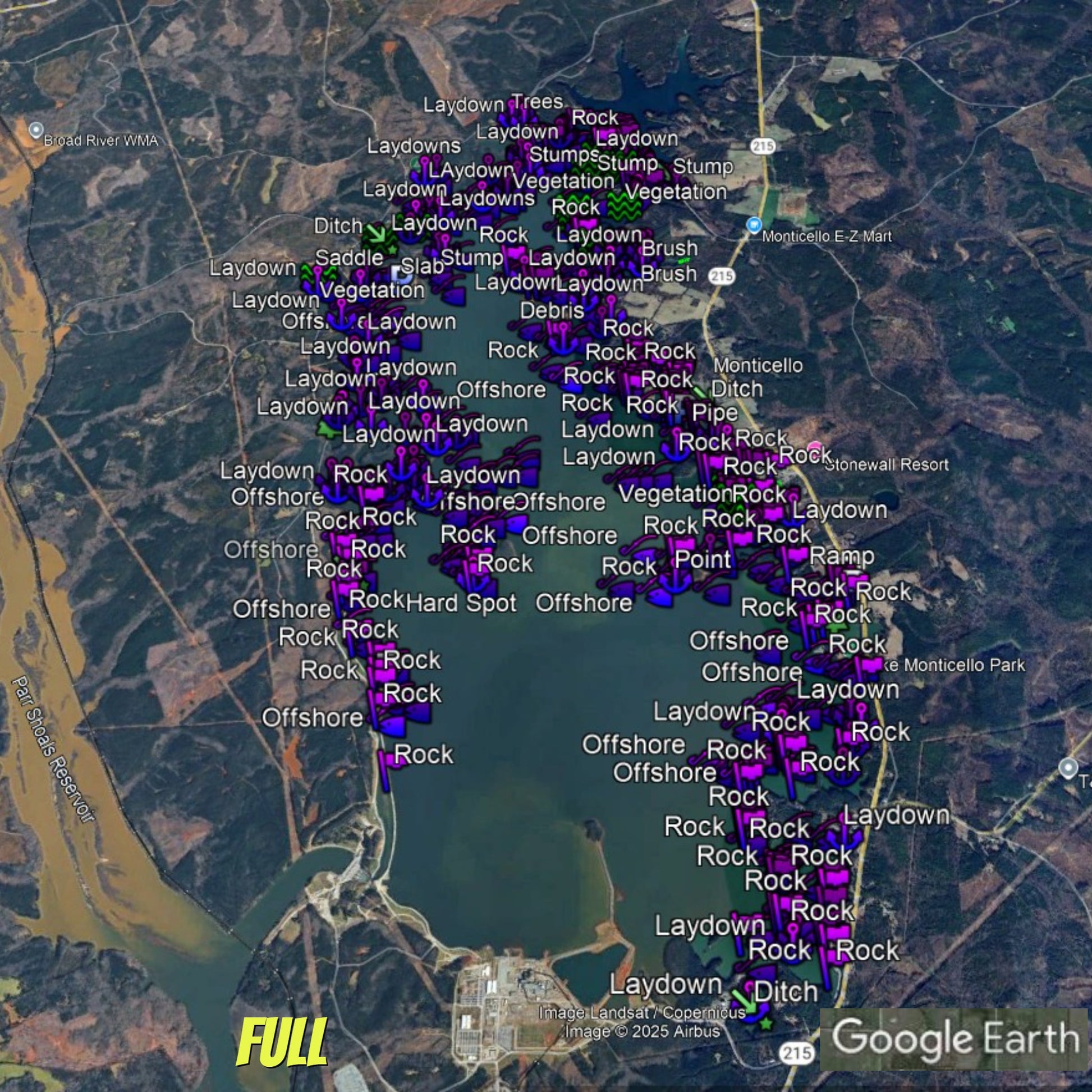 Discover the ultimate bass fishing secrets at Monticello Reservoir with our meticulously crafted fishing waypoints. Leveraging the power of Google Earth®, Navionics® as well as other tools, we've pinpointed the most productive hot spots where bass thrive. Delve into the intricacies of the lake breakdown, as our waypoints lead you to strategic locations like brush piles, ledges, rocks, and timber, ensuring you're at the heart of the action.