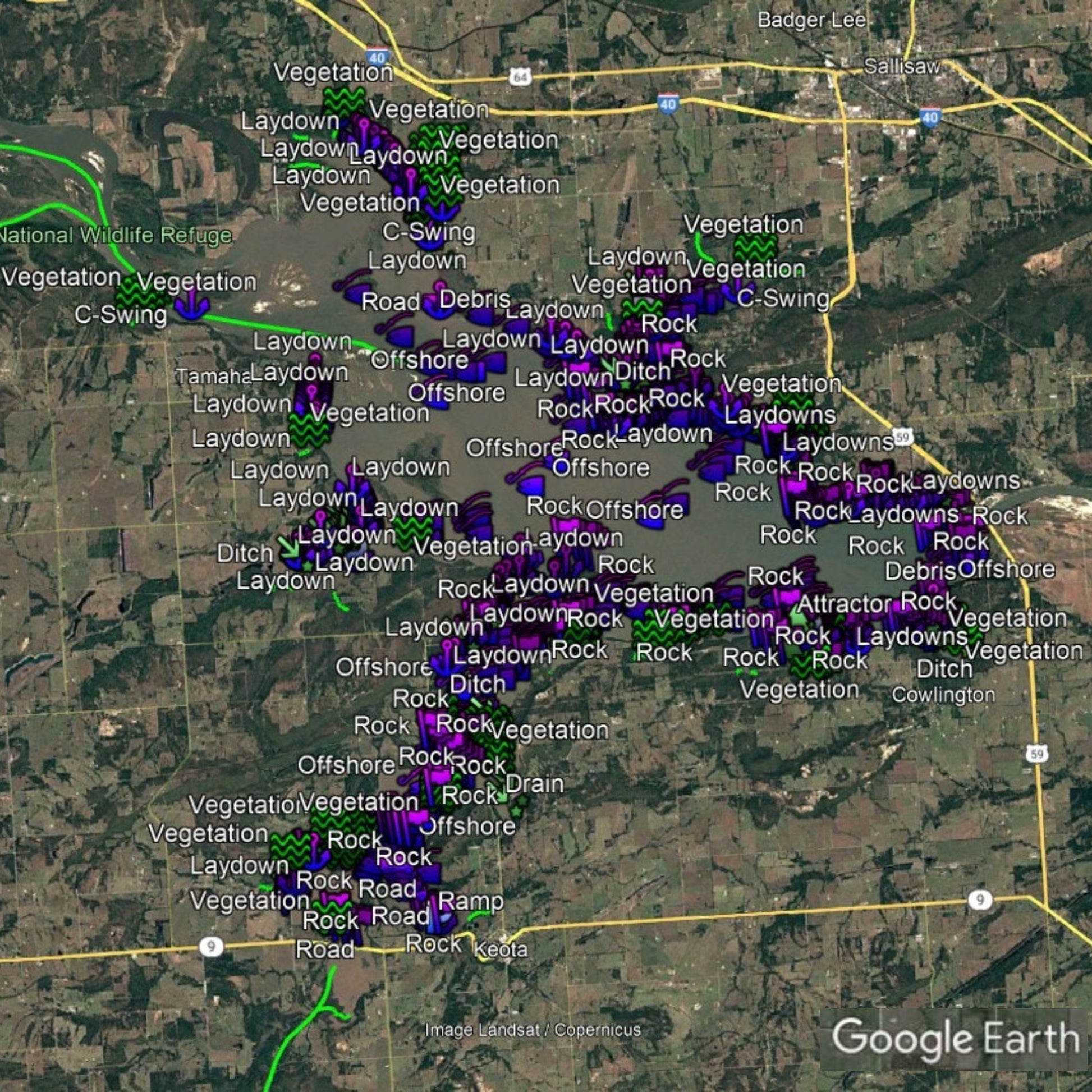 Discover the ultimate bass fishing secrets at Robert S. Kerr Reservoir with our meticulously crafted fishing waypoints. Leveraging the power of Google Earth®, Navionics® as well as other tools, we've pinpointed the most productive hot spots where bass thrive. Delve into the intricacies of the lake breakdown, as our waypoints lead you to strategic locations like brush piles, ledges, rocks, and timber, ensuring you're at the heart of the action.