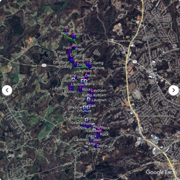 Discover the ultimate bass fishing secrets at Saluda Lake, SC with our meticulously crafted fishing waypoints. Leveraging the power of Google Earth®, Navionics® as well as other tools, we've pinpointed the most productive hot spots where bass thrive. Delve into the intricacies of the lake breakdown, as our waypoints lead you to strategic locations like brush piles, ledges, rocks, and timber, ensuring you're at the heart of the action.
