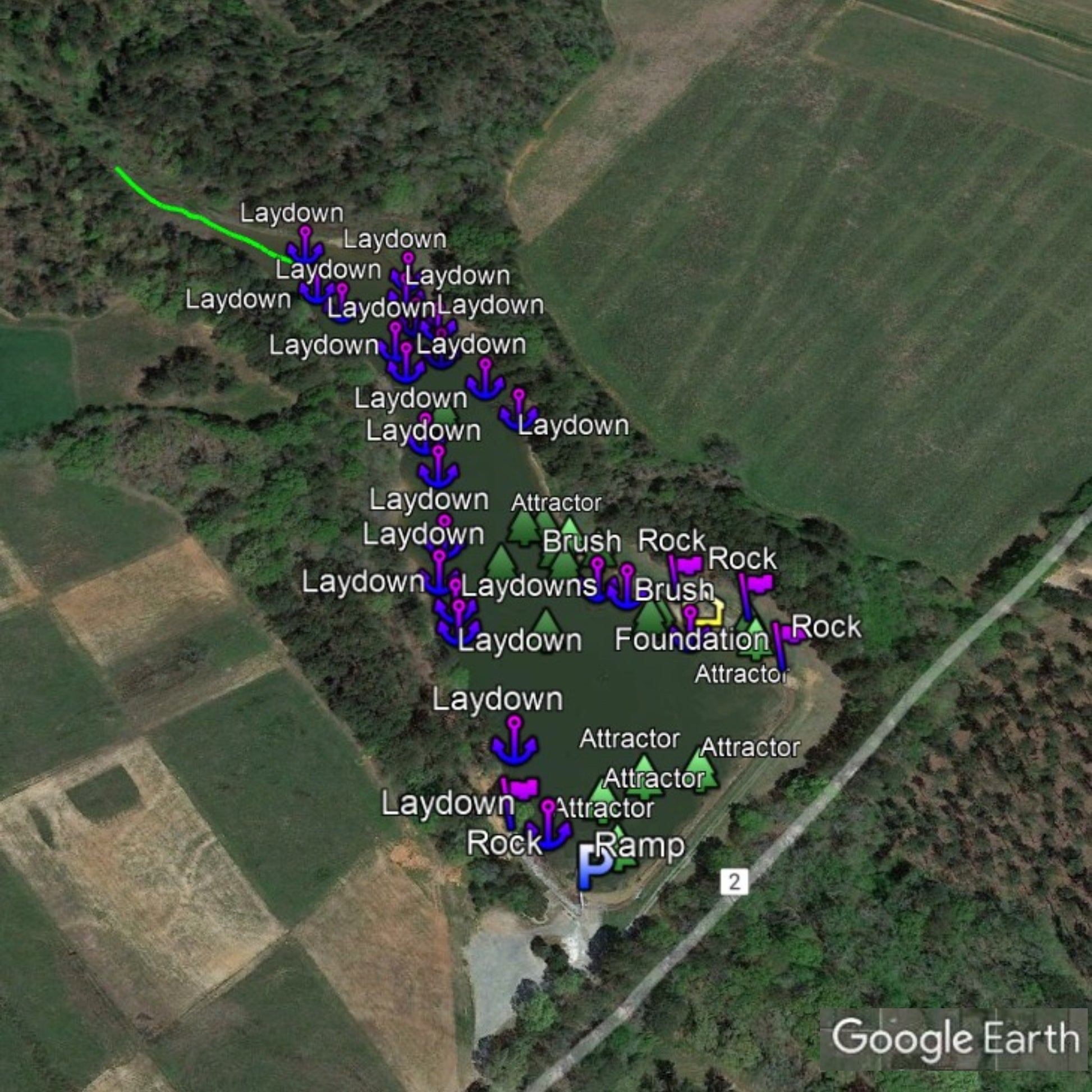 Discover the ultimate bass fishing secrets at Sheppard Lake, GA with our meticulously crafted fishing waypoints. Leveraging the power of Google Earth®, Navionics® as well as other tools, we've pinpointed the most productive hot spots where bass thrive. Delve into the intricacies of the lake breakdown, as our waypoints lead you to strategic locations like brush piles, ledges, rocks, and timber, ensuring you're at the heart of the action.