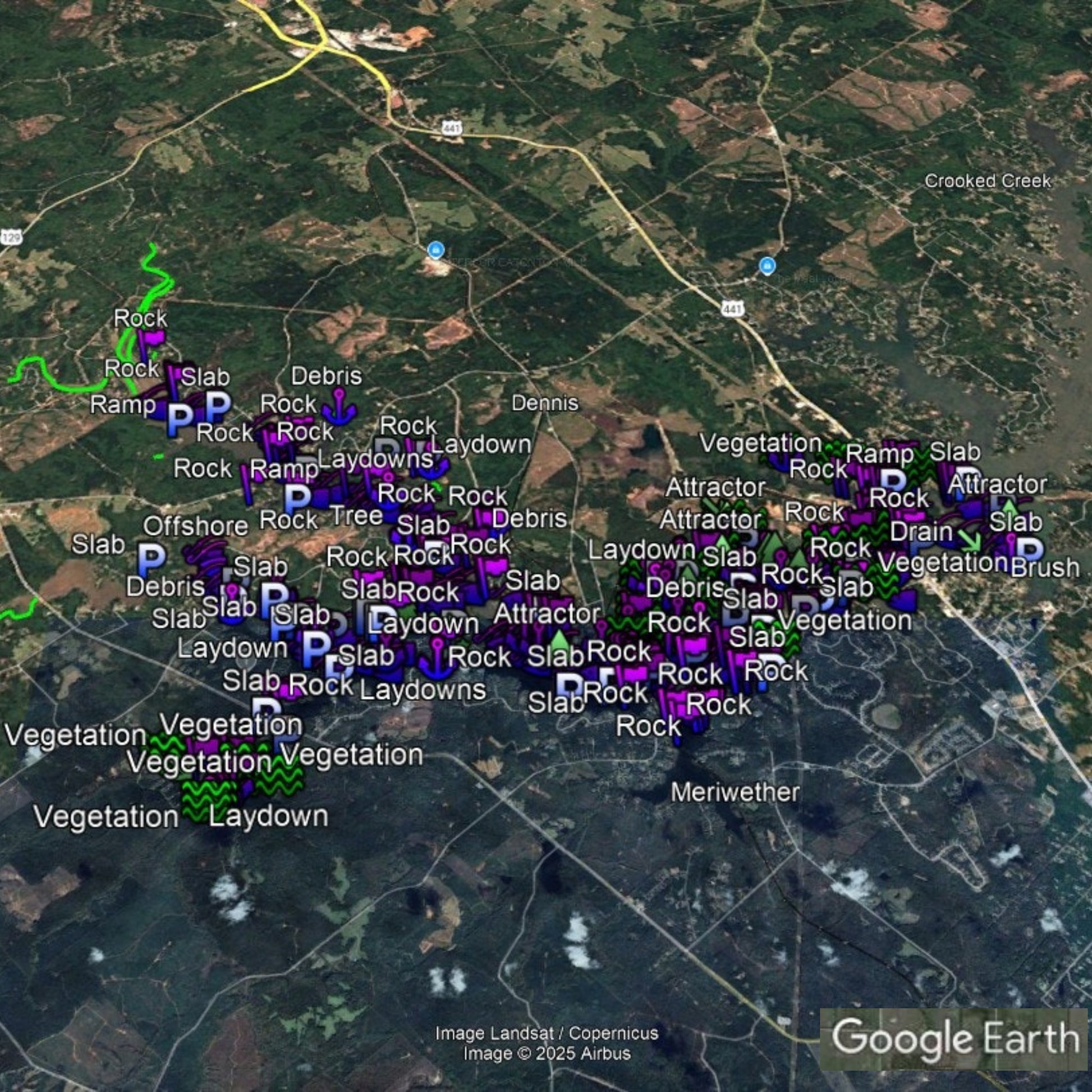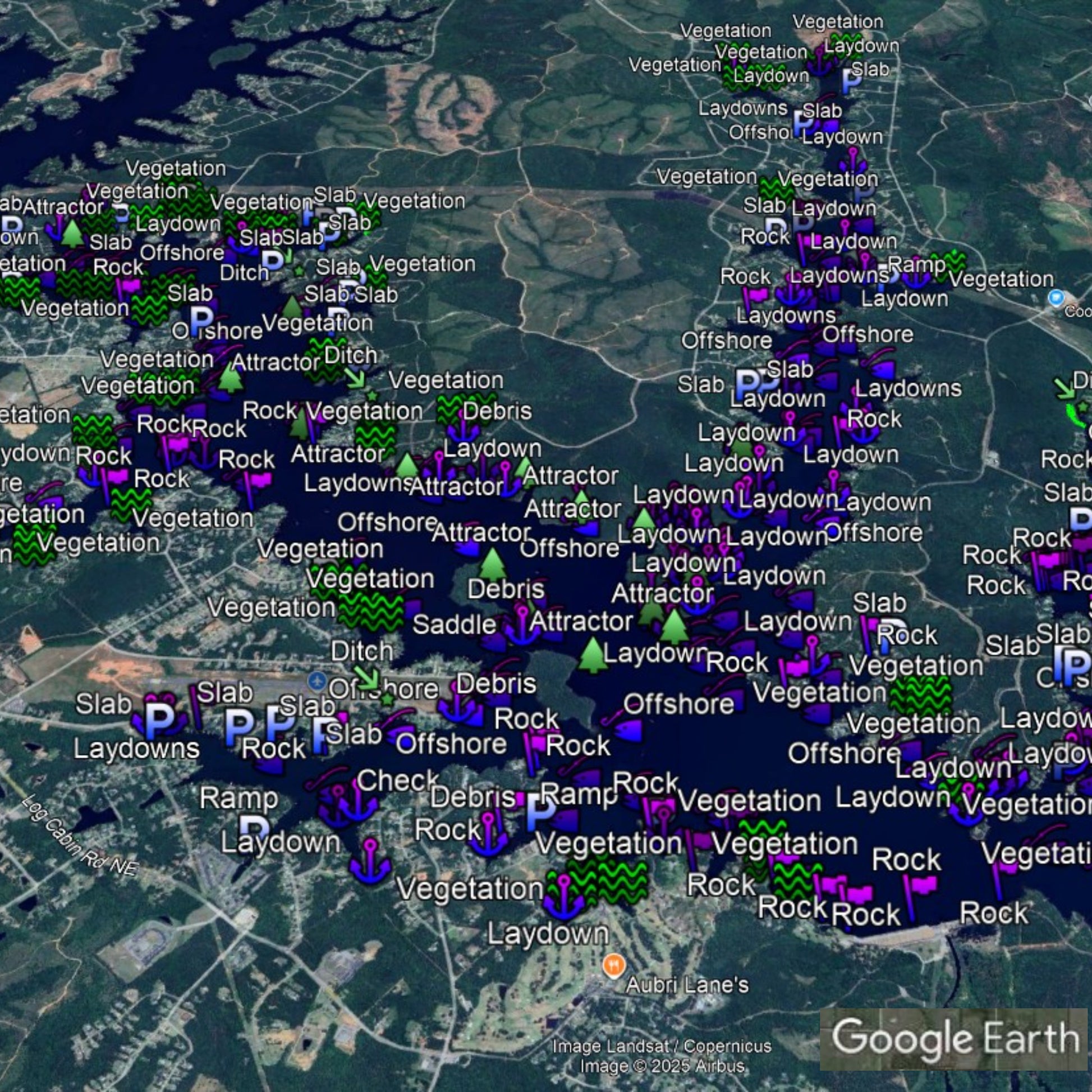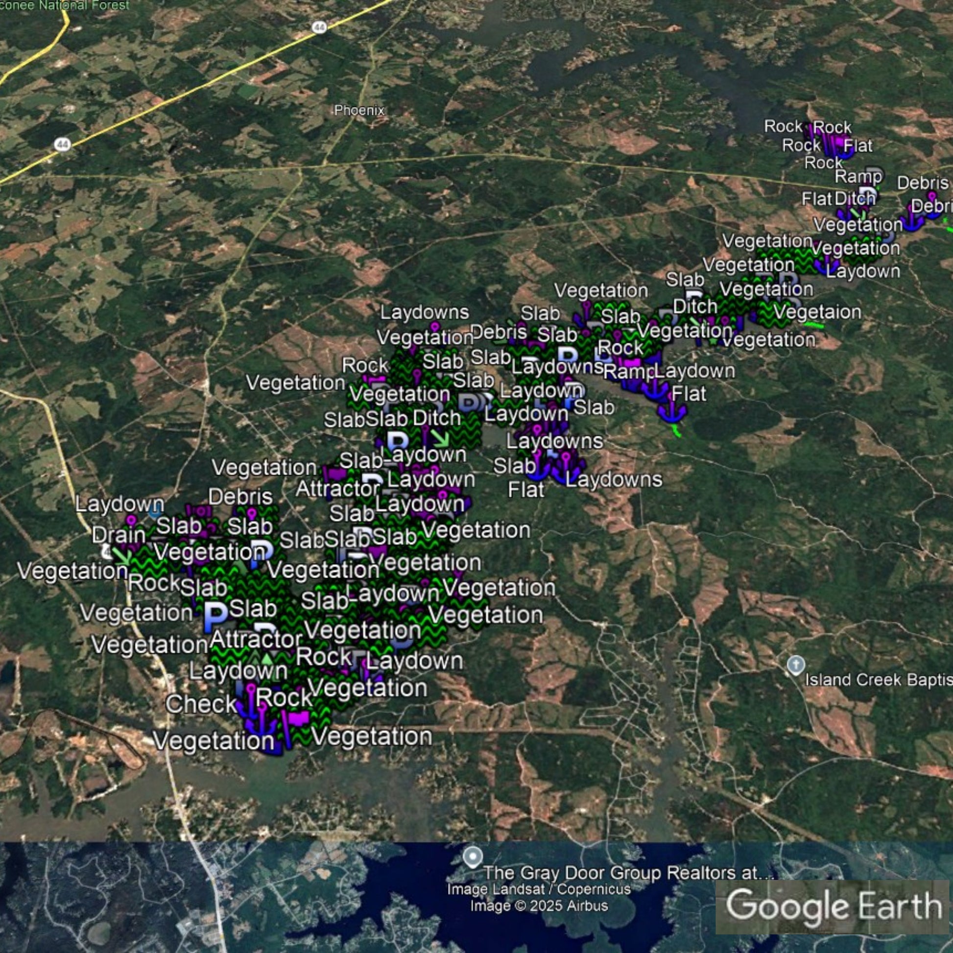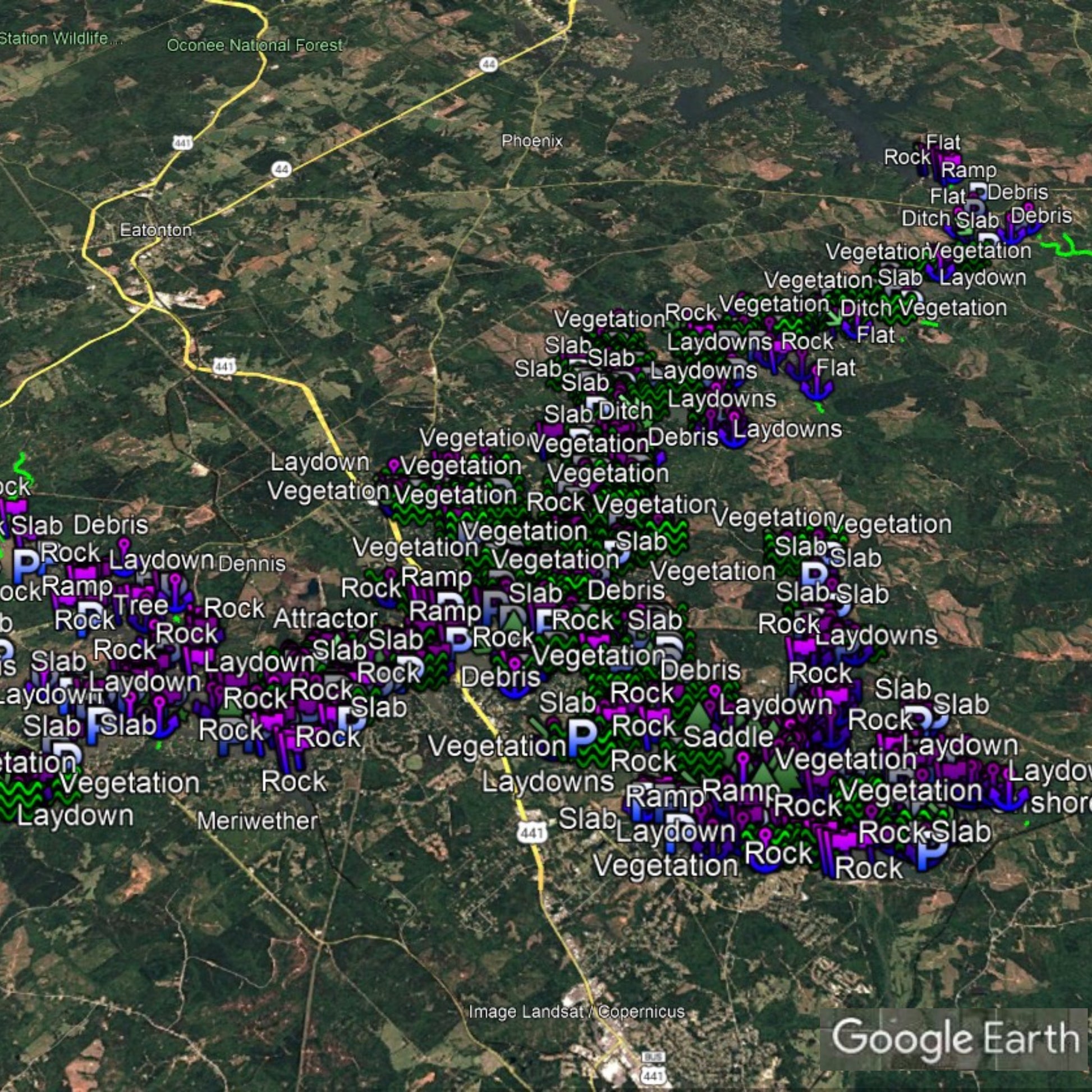 Discover the ultimate bass fishing secrets at Lake Sinclair, GA with our meticulously crafted fishing waypoints. Leveraging the power of Google Earth®, Navionics® as well as other tools, we've pinpointed the most productive hot spots where bass thrive. Delve into the intricacies of the lake breakdown, as our waypoints lead you to strategic locations like brush piles, ledges, rocks, and timber, ensuring you're at the heart of the action.