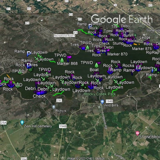 Discover the ultimate bass fishing secrets at Lake Somerville with our meticulously crafted fishing waypoints. Leveraging the power of Google Earth®, Navionics® as well as other tools, we've pinpointed the most productive hot spots where bass thrive. Delve into the intricacies of the lake breakdown, as our waypoints lead you to strategic locations like brush piles, ledges, rocks, and timber, ensuring you're at the heart of the action.