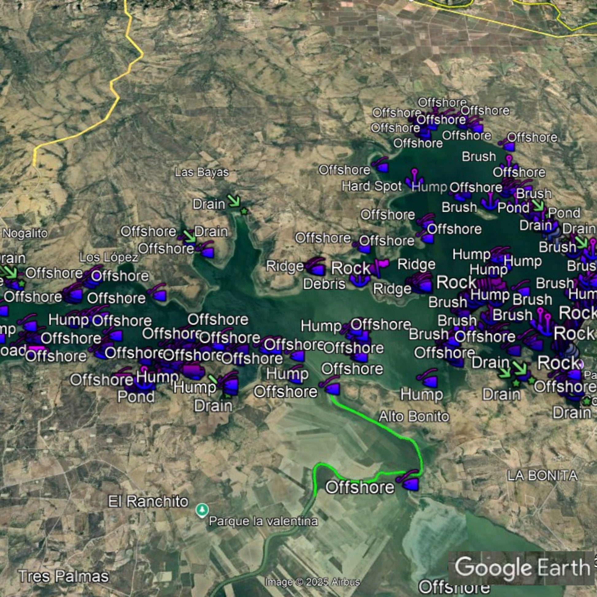 Discover the ultimate bass fishing secrets at Sugar Lake, Mexico with our meticulously crafted fishing waypoints. Leveraging the power of Google Earth®, Navionics® as well as other tools, we've pinpointed the most productive hot spots where bass thrive. Delve into the intricacies of the lake breakdown, as our waypoints lead you to strategic locations like brush piles, ledges, rocks, and timber, ensuring you're at the heart of the action.