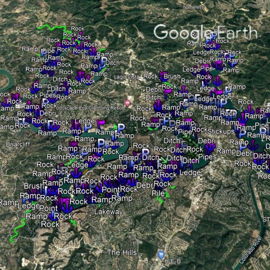 Discover the ultimate bass fishing secrets at Lake Travis with our meticulously crafted fishing waypoints. Leveraging the power of Google Earth®, Navionics® as well as other tools, we've pinpointed the most productive hot spots where bass thrive. Delve into the intricacies of the lake breakdown, as our waypoints lead you to strategic locations like brush piles, ledges, rocks, and timber, ensuring you're at the heart of the action.