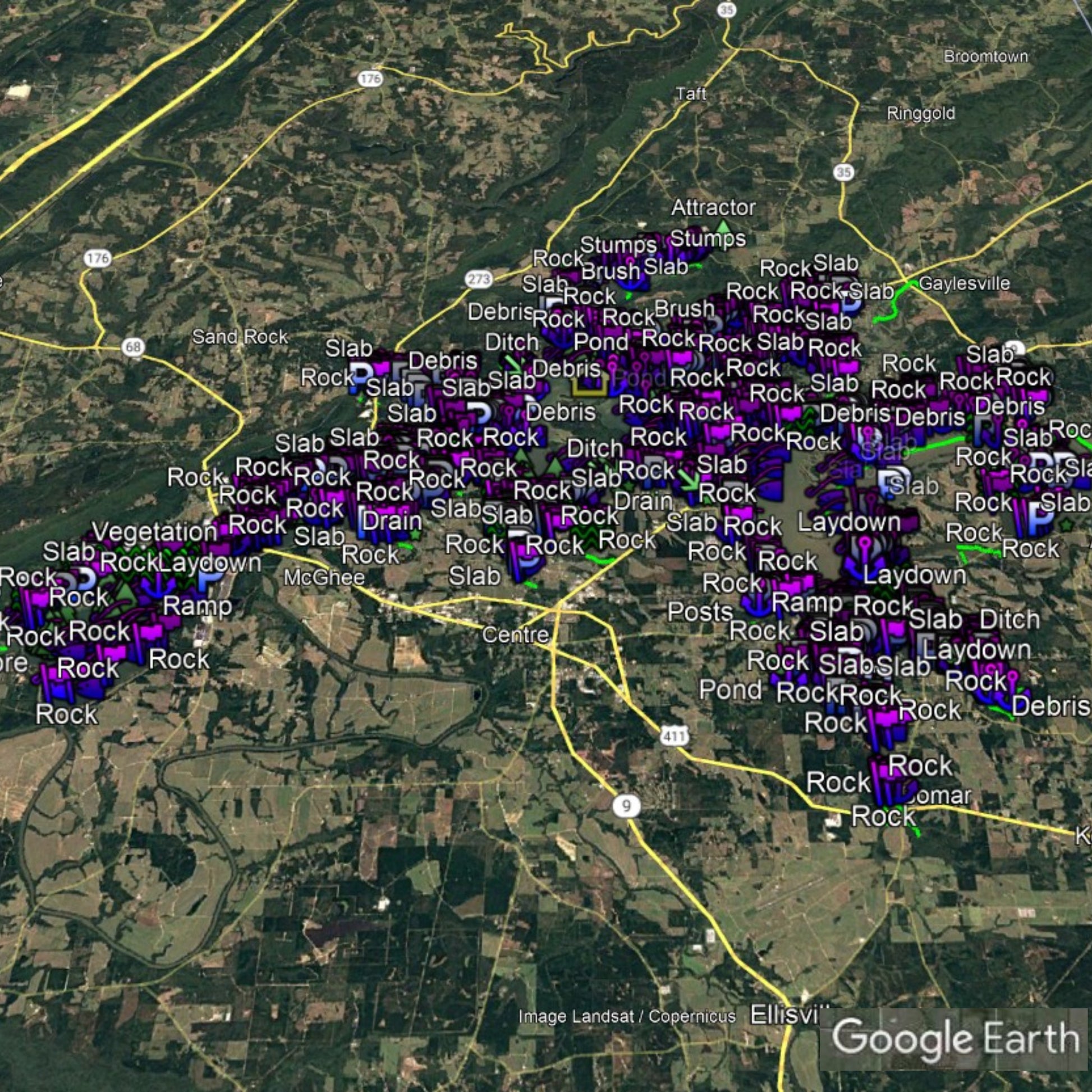 Discover the ultimate bass fishing secrets at Weiss Lake, AL with our meticulously crafted fishing waypoints. Leveraging the power of Google Earth®, Navionics® as well as other tools, we've pinpointed the most productive hot spots where bass thrive. Delve into the intricacies of the lake breakdown, as our waypoints lead you to strategic locations like brush piles, ledges, rocks, and timber, ensuring you're at the heart of the action.