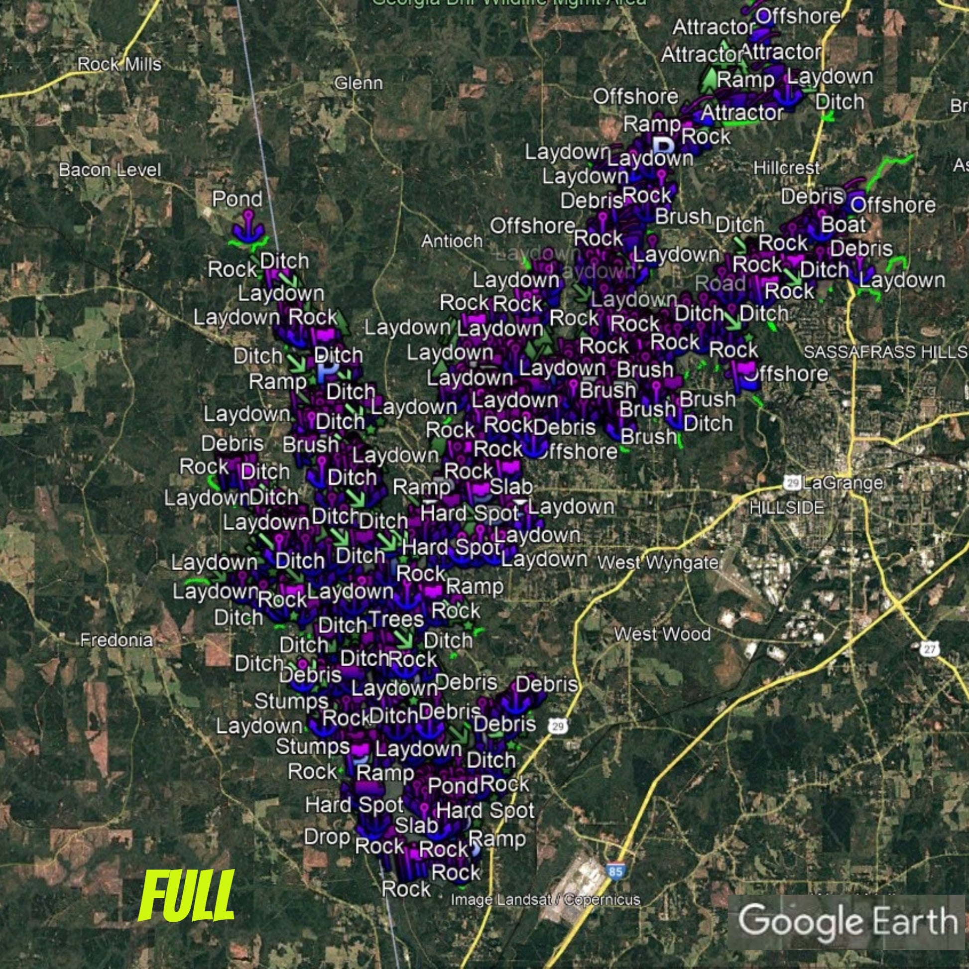 Discover the ultimate bass fishing secrets at West Point Lake, GA with our meticulously crafted fishing waypoints. Leveraging the power of Google Earth®, Navionics® as well as other tools, we've pinpointed the most productive hot spots where bass thrive. Delve into the intricacies of the lake breakdown, as our waypoints lead you to strategic locations like brush piles, ledges, rocks, and timber, ensuring you're at the heart of the action.