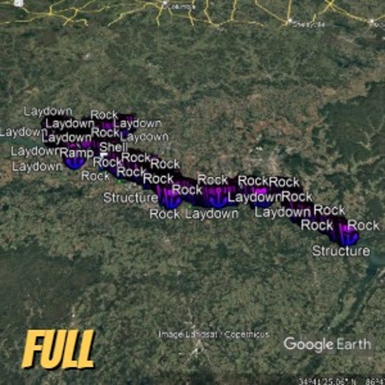 Discover the ultimate bass fishing secrets at Wheeler Lake, AL with our meticulously crafted fishing waypoints. Leveraging the power of Google Earth®, Navionics® as well as other tools, we've pinpointed the most productive hot spots where bass thrive. Delve into the intricacies of the lake breakdown, as our waypoints lead you to strategic locations like brush piles, ledges, rocks, and timber, ensuring you're at the heart of the action.